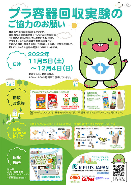 アールプラスジャパンの活動として、カルビー株式会社と日清オイリオグループ株式会社と共にプラスチック回収の取組を実施。